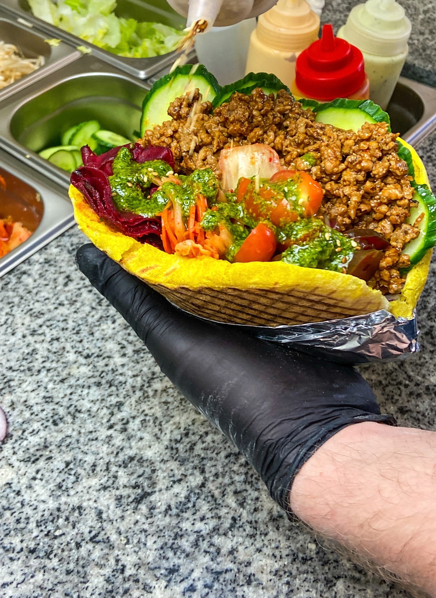 150G mięsa wołowego, 4 krewetki, ogórek kim-chi, świeże warzywa, spicy mayo -